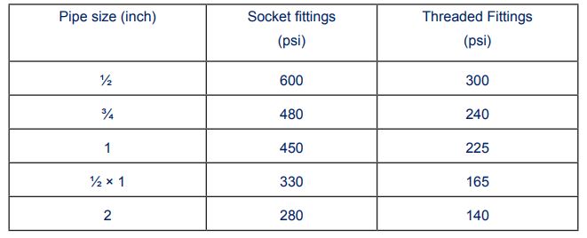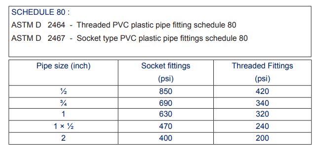 - Water pressure rating (max) for PVC schedule 80 fittings at 73 Deg. F.