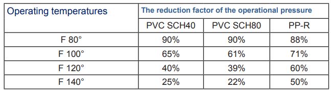 - Water pressure rating (Max) for PVC schedule 40 fittings at 73 Deg. F. are shown below.