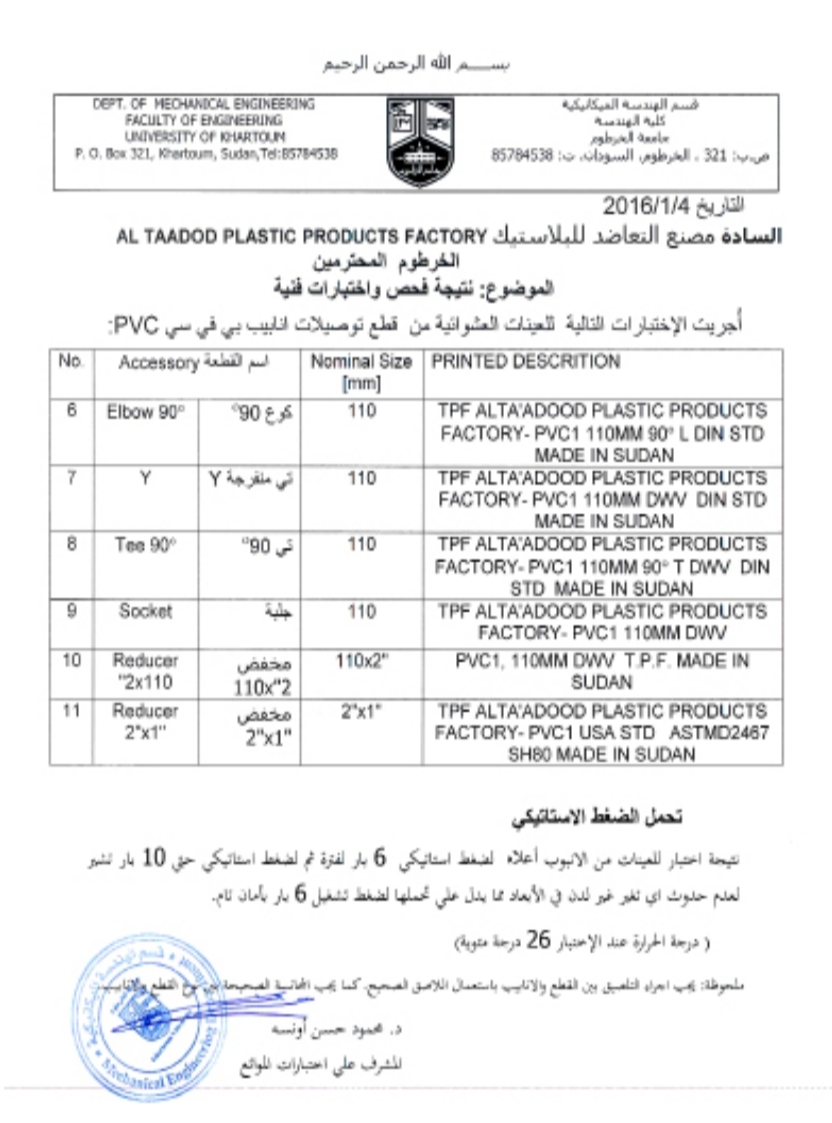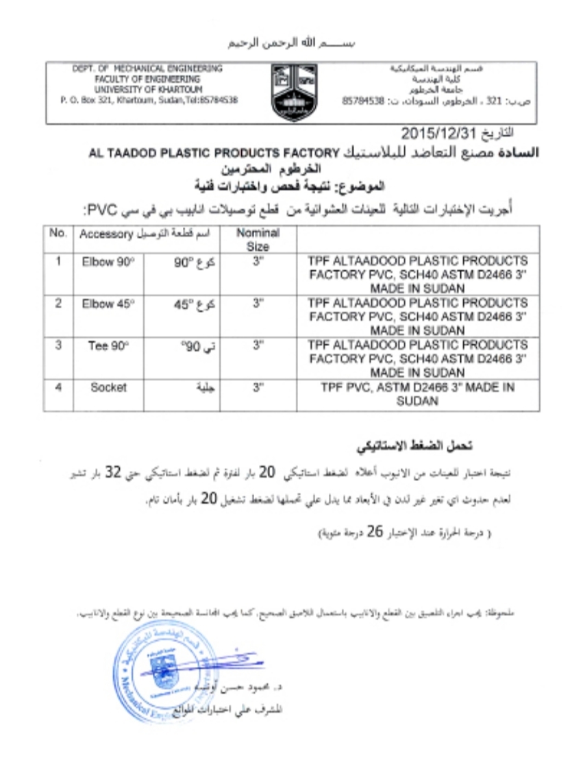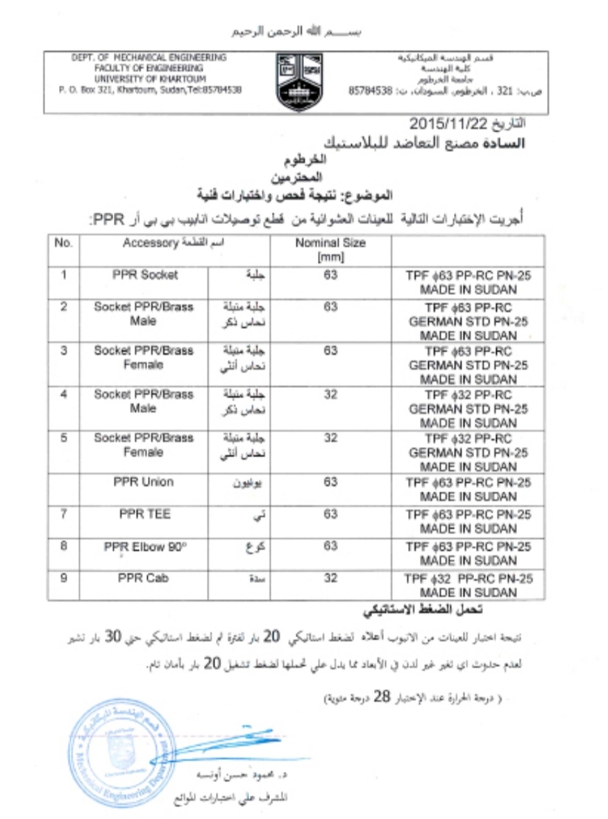 The products of the Ta’adhad Factory (TPF) are characterized by high quality, as they are produced in accordance with Sudanese, European and American specifications. Ta’adhud Plastic Products